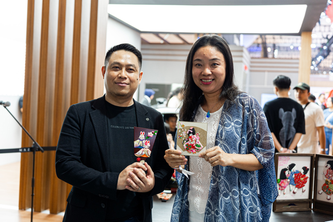 Gambar 4 – Seniman Kurumie Linda Khang memamerkan hasil karyanya. Nilai-nilai yang tercermin pada kerajinan Kurumie selaras dengan filosofi Kaicho Mazda, yang memiliki arti "harmoni" atau "keselarasan."